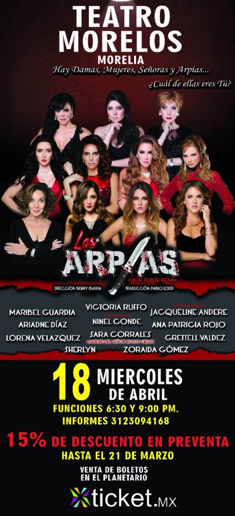 “Las Arpías” llegará al Teatro Morelos el próximo miércoles 18 de abril con dos funciones: 6:30 pm y 9:00 pm, los boletos ya están a la venta en las taquillas del Planetario con un horario de 11:00 am a 7:00 pm de lunes a viernes y el sábado de 11:00 am a 2:00 pm, también a través del sistema www.xticket.mx.