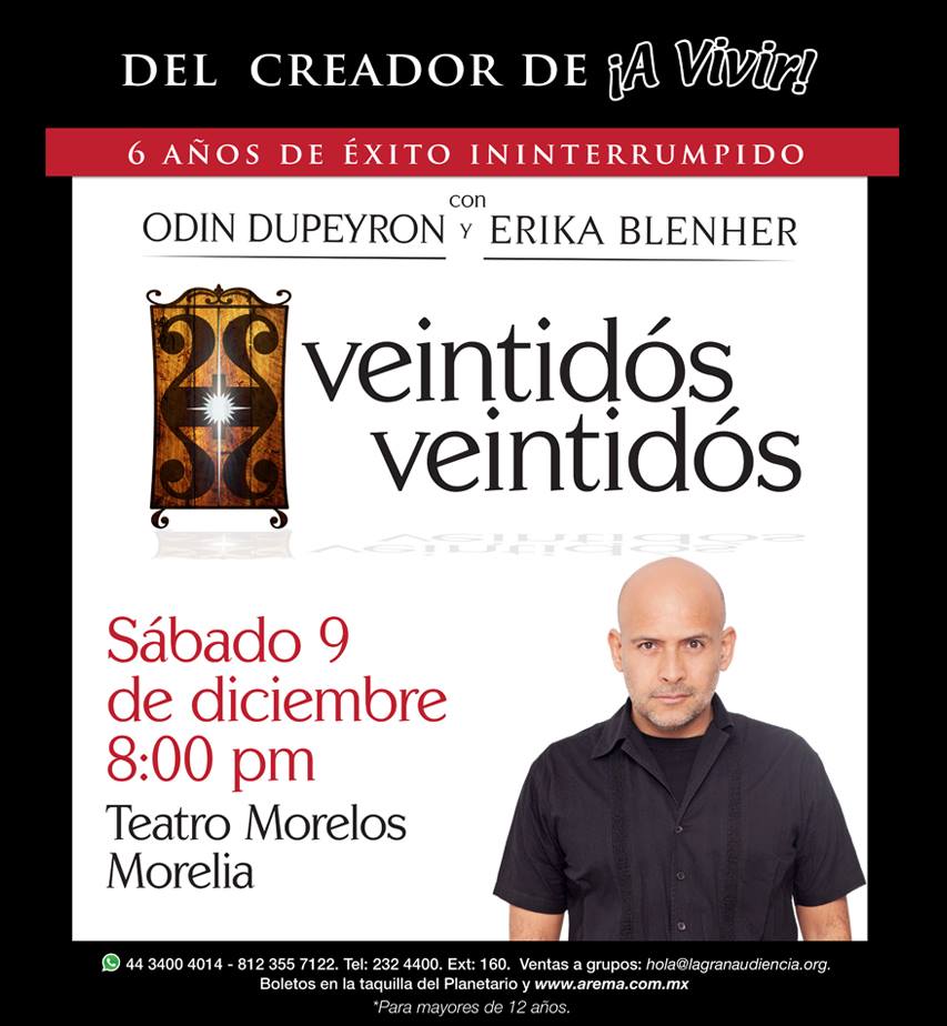 Morelia, Michoacán.- El ídolo Odín Dupeyrón regresará Morelia el próximo sábado 9 de diciembre para presentar su puesta en escena “Veintidós Veintidós” en compañía de Erika Blenher, con una única función a las 20:00 horas en el Teatro Morelos.