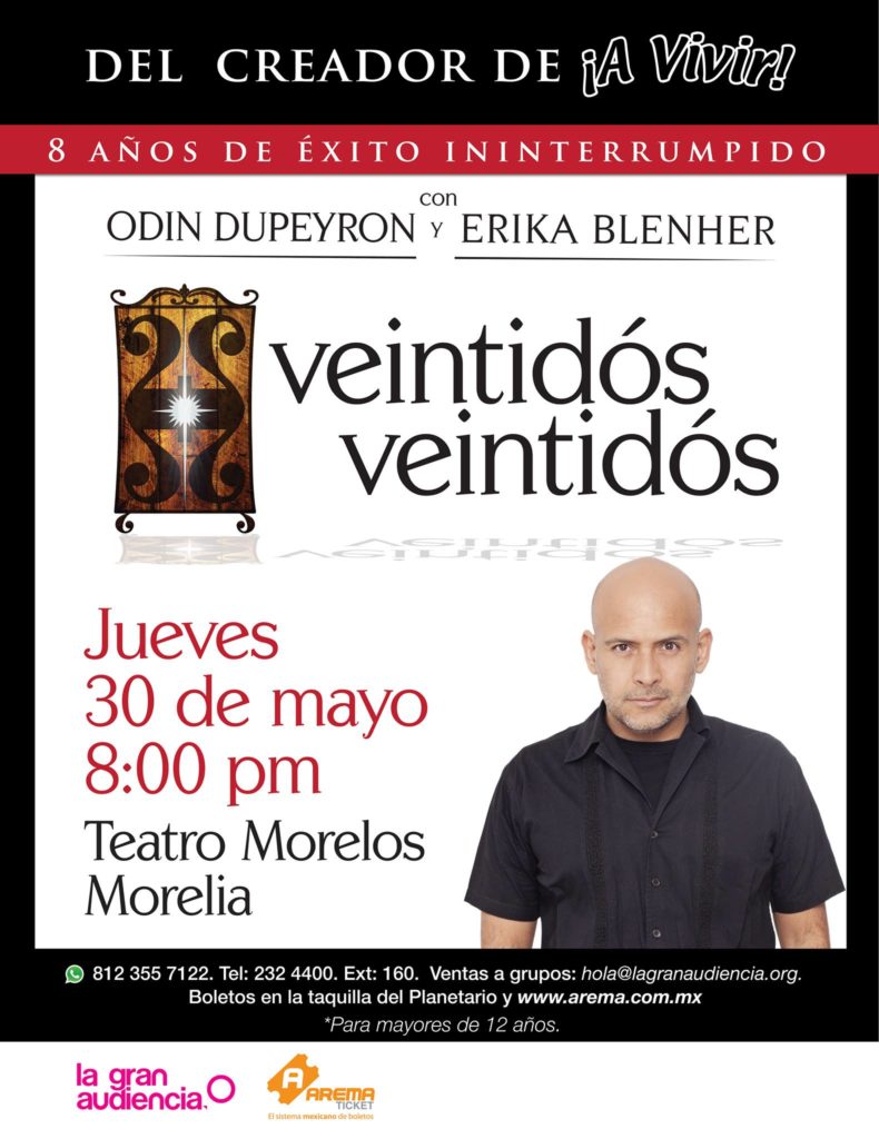 Morelia, Michoacán.- Con ocho años ininterrumpidos de éxito, Odín Dupeyrón regresa a Morelia para presentar “Veintidós Veintidós” el próximo jueves 30 de mayo en el Teatro Morelos con una única función a las 20:00 horas.