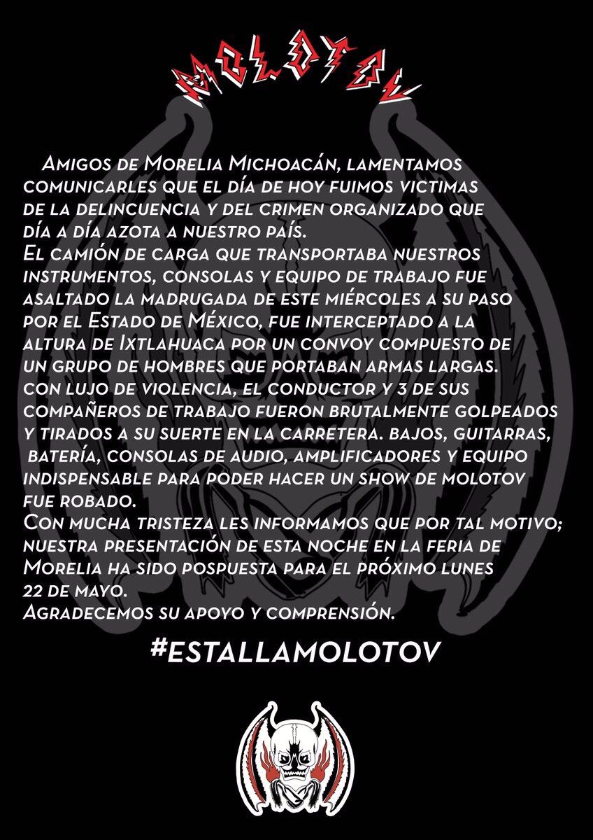 Morelia, Michoacán.- La Comisión de Ferias, Exposiciones y Eventos del Estado de Michoacán (Cofeeem) informa que por causas de fuerza mayor y ajenas a esta dependencia, el concierto que el grupo de rock Molotov ofrecería la noche de este miércoles en el Teatro del Pueblo de la Expo Fiesta Michoacán se llevará a cabo el próximo lunes.