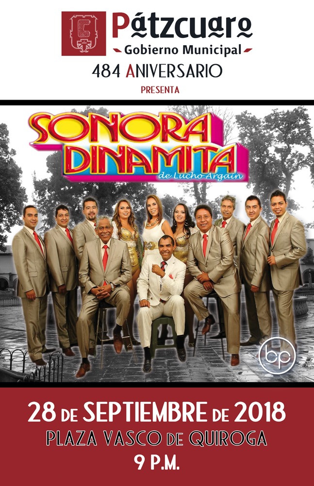 Morelia, Michoacán.- Para celebrar el 484 Aniversario de la fundación de Pátzcuaro, Michoacán, el próximo viernes 28 de septiembre la Sonora Dinamita de Lucho Argaín, amenizará el festejo del Pueblo Mágico con un concierto a las 22:00 horas en la Plaza Vasco de Quiroga.