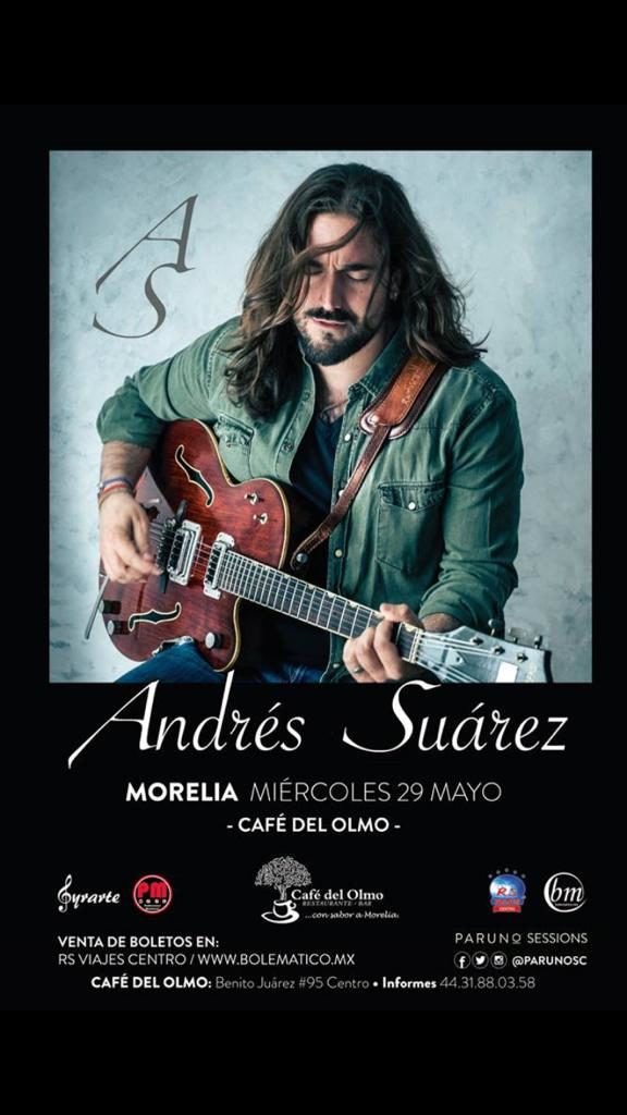 Morelia, Michoacán.- El próximo miércoles 29 de mayo, el cantautor español Andrés Suárez, ofrecerá un concierto en el Café del Olmo de Morelia a partir de las 8:30 PM, evento a cargo de Gyrarte y Producciones Michoacán (PM).
