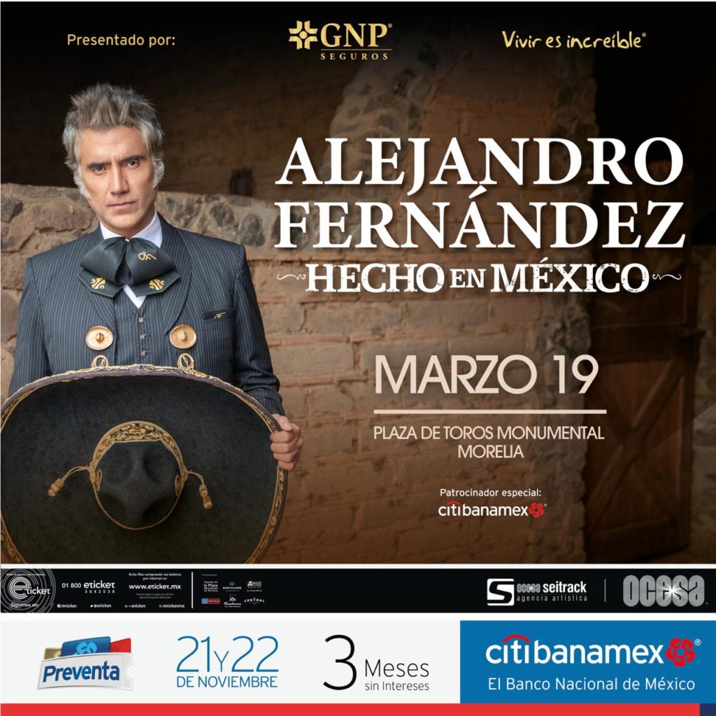 Morelia, Michoacán.- La preventa Citibanamex con tres meses sin intereses para el concierto en 360º de Alejandro Fernández en Morelia, el próximo jueves 19 de marzo en la Plaza Monumental a las 9:00 PM, será este jueves 21 y viernes 22 de noviembre a través de www.eticket.mx y puntos de venta autorizados (Farmacia del Ahorro Suc. Enrique Ramírez, Sport Palace “Las Américas”, La Central Food & Rock y Bartolomé Agavería).