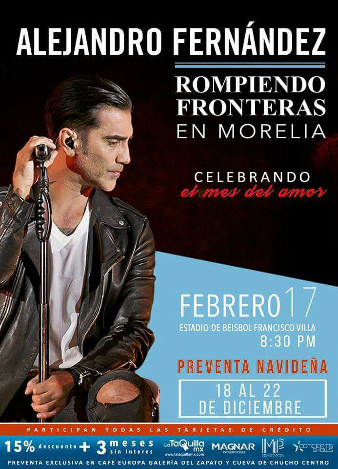 Morelia, Michoacán.- Del 18 al 22 de diciembre, se llevará a cabo la preventa navideña especial para el concierto de Alejandro Fernández del próximo sábado 17 de febrero del 2018 en el Estadio de Béisbol “Francisco Villa” de Morelia.