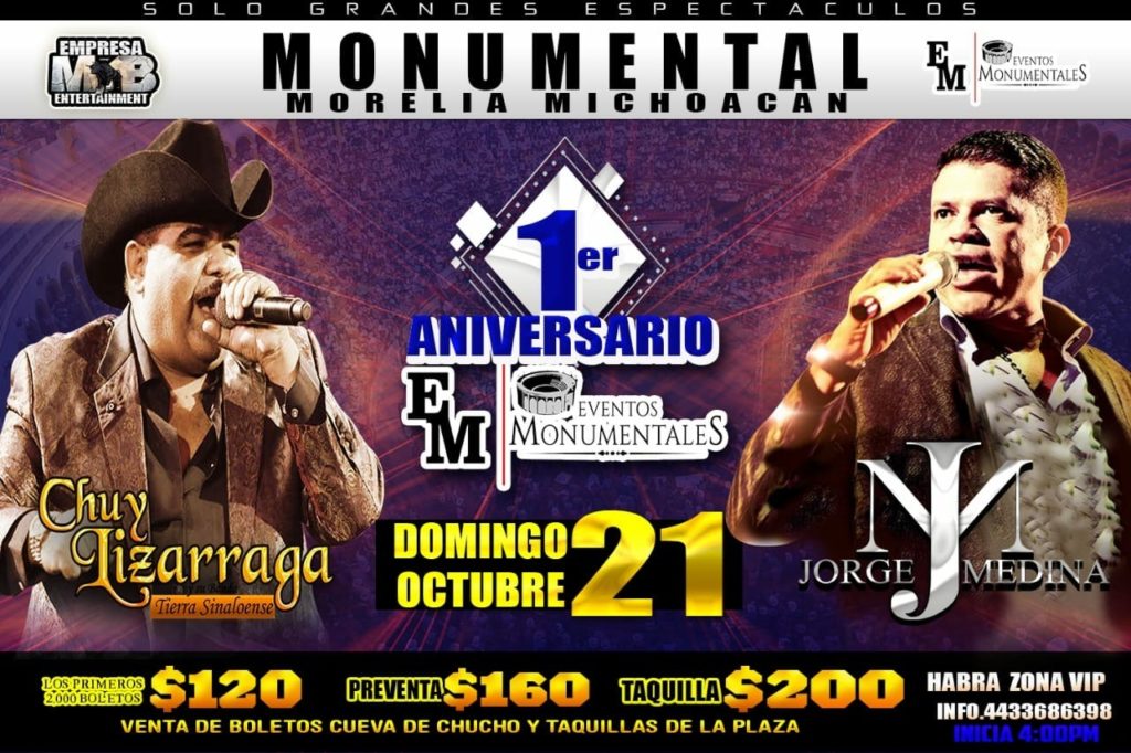 Morelia, Michoacán.- Al ritmo de la música sinaloense de Chuy Lizárraga y Jorge Medina, la Empresa MB y Eventos Monumentales, celebrarán su Primer Aniversario en próximo domingo 21 de octubre en la Monumental de Morelia con un sensacional jaripeo-baile desde las 16:00 horas.