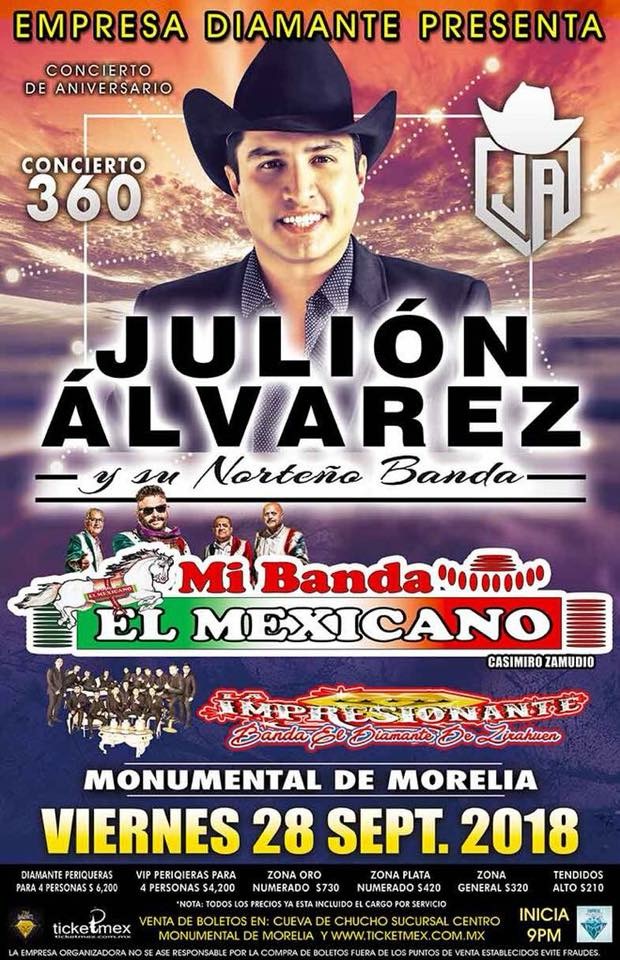 Morelia, Michoacán.- El ídolo Julión Álvarez y su Norteño Banda, se presentará el próximo viernes 28 de septiembre en la Monumental de Morelia a las 21:00 horas, en un magno concierto de 360º a cargo de la Empresa Diamante MG.
