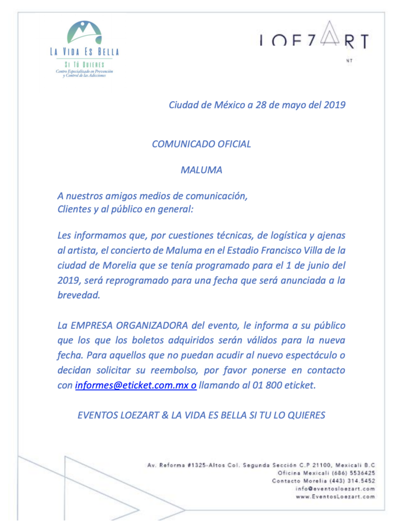 Les informamos que, por cuestiones técnicas, de logística y ajenas al artista, el concierto de Maluma en el Estadio Francisco Villa de la ciudad de Morelia que se tenía programado para el 1 de junio del 2019, será reprogramado para una fecha que será anunciada a la brevedad.